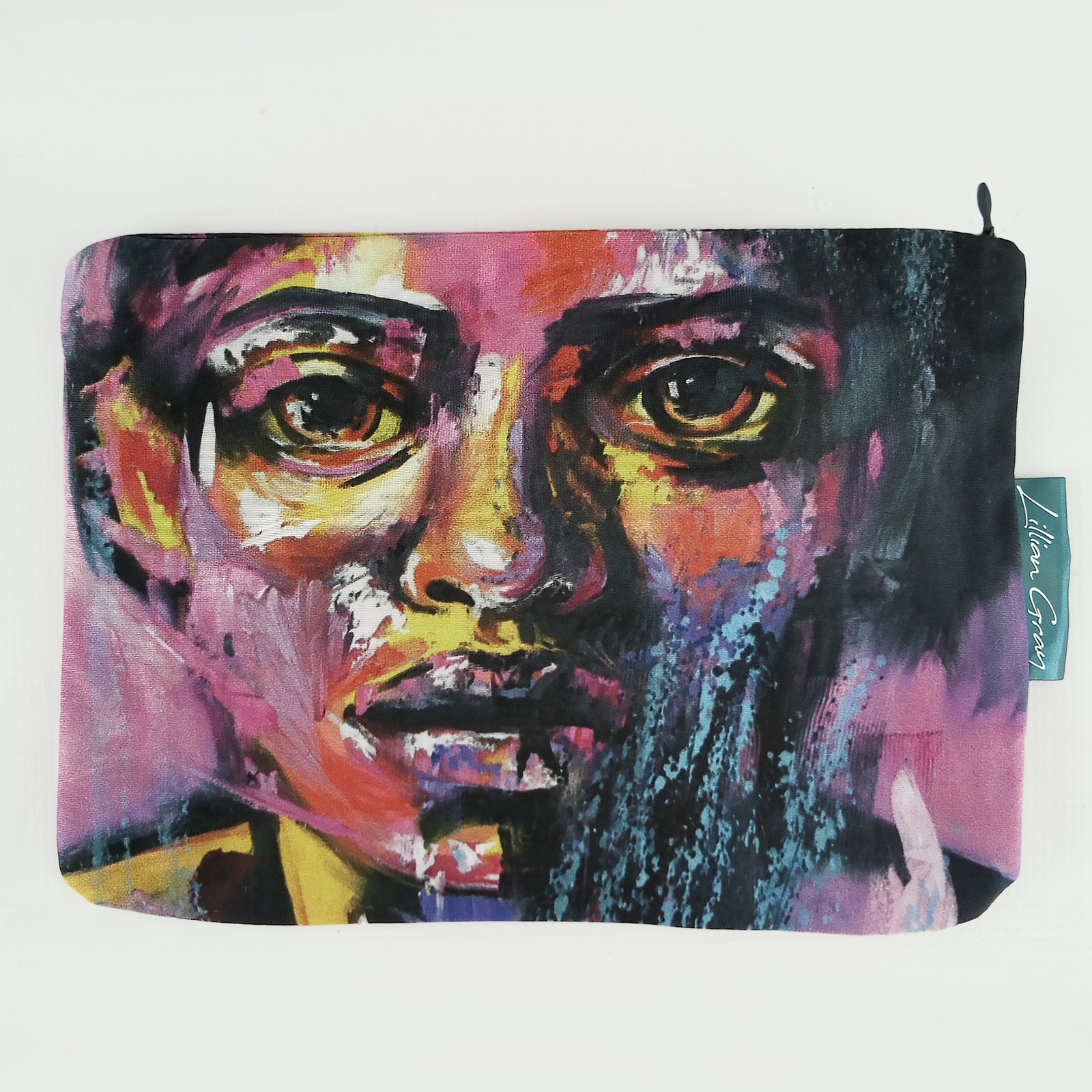 Adorned with Lillian Gray’s glowing “Lesedi” portrait, this bag radiates a sun-drenched, optimistic energy through its dominant palette of warm pinks and luminous yellows, accented by vibrant pops of orange and red. It is the perfect size for tech accessories, art supplies, or your daily essentials, making it a functional canvas you can carry anywhere.