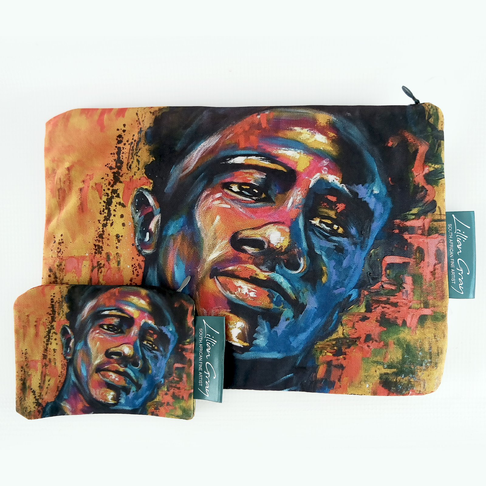 Adorned with Lillian Gray’s “Nathi” portrait, this bag radiates a warm and inviting energy through its dominant palette of rich teals and golden yellows, balanced by deep blues and earthy accents. It is the perfect size for tech accessories, art supplies, or your daily essentials, making it a functional canvas you can carry anywhere.